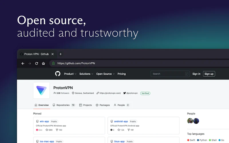 Proton VPN được người dùng khắp thế giới ưa chuộng bởi 1 lý do quan trọng nó là phần mềm mã mở – lập trình và phát triển công khai trên GitHub, bất cứ ai cũng có thể vào kiểm tra các đoạn code.